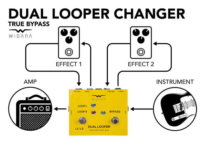Přímý průchod signálu True Bypass Boxem nebo přepnutím switche rychlé přepínání mezi efektovými smyčkami – indikace rozsvícením LED.