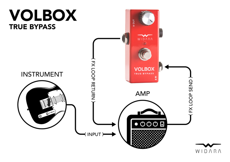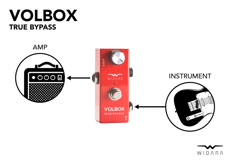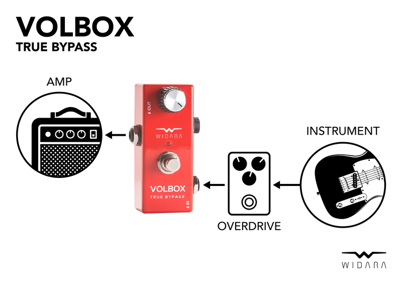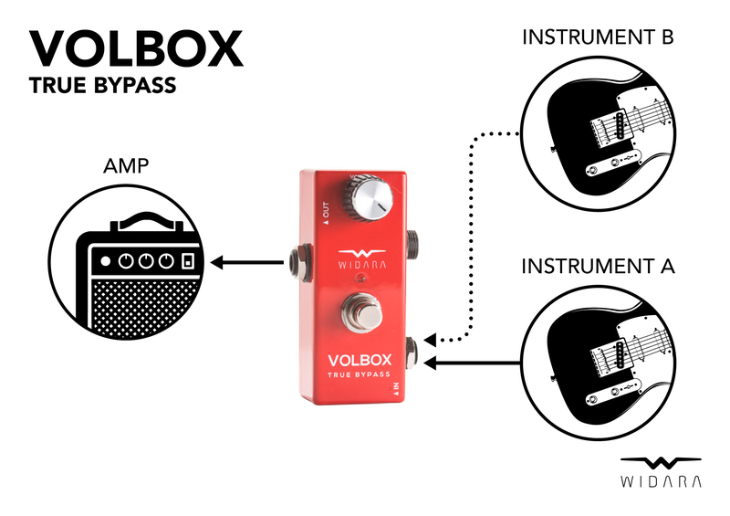 Přímý průchod signálu True Bypass Boxem nebo přepnutím switche přesměrování signálu přes potenciometr - možnost regulace výstupní úrovně signálu - hlasitosti. Aktivní cesta je indikována rozsvícením LED.